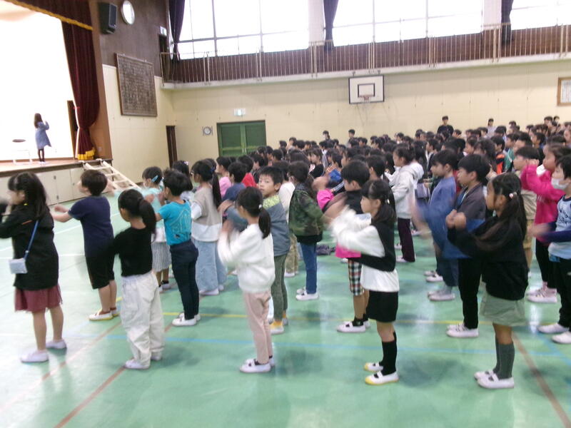 初めに、保健委員さんが前に出て、姿勢体操をしました。保健委員さんが体操の流れをしっかりと呼びかけてくれました。